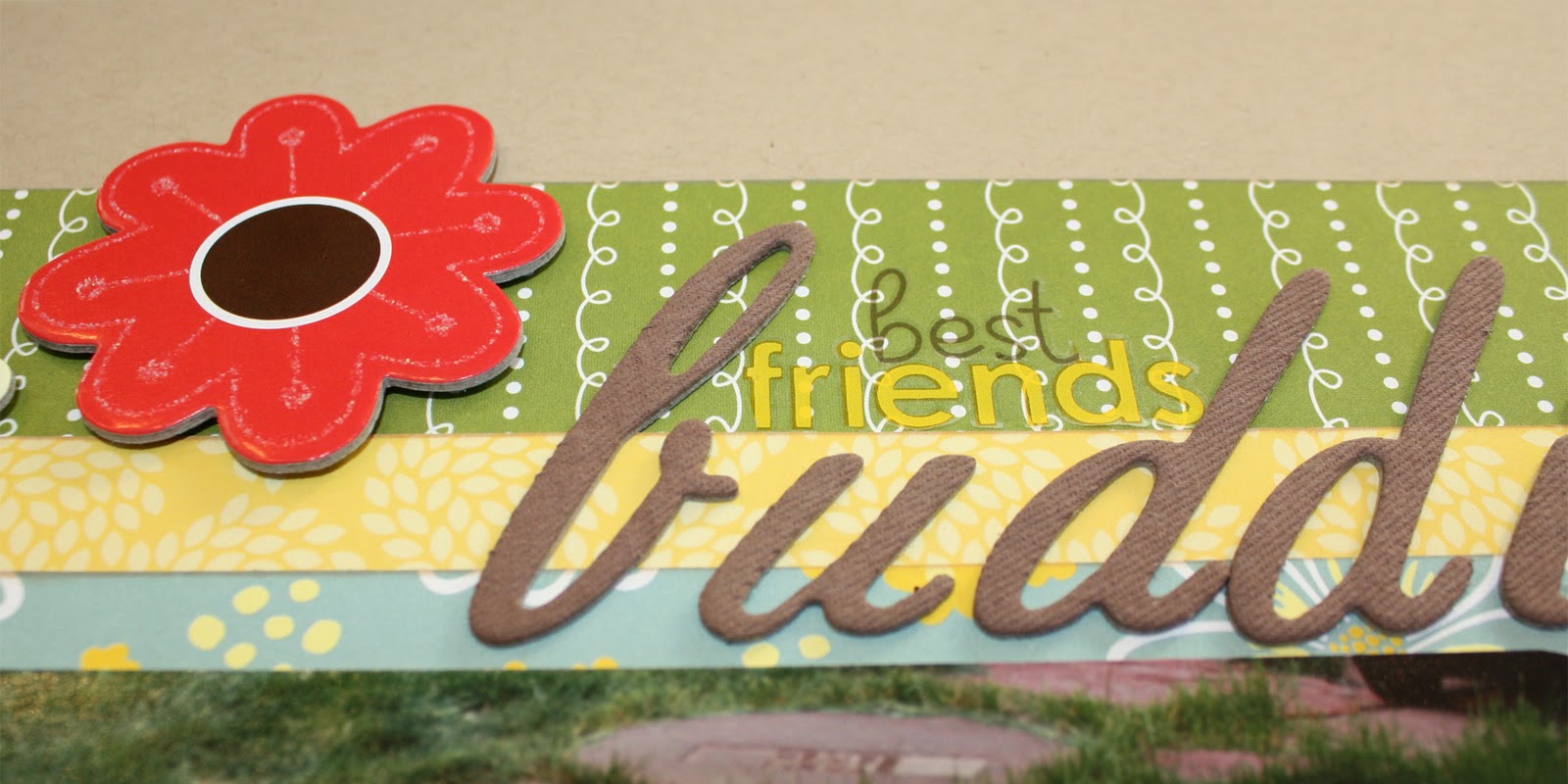 Each day on the Pebbles Blog there is a new theme or challenge to think about.  My task for this layout of my daughter and our dog was to Mix and Match two or more Pebble collections.  So I chose to combine the Tree House and May Bouquet collections.  At first sight, they don't really look like they go together, but the yellows and greens in the Tree House collection were a perfect match for the May Bouquet floral paper I chose because of how it complements the photo.  But...then I thought it would be fun to add a pop of red with the Tree House Chipboard and Red Candy Dots, which created a nice contrast. Finally to finish it off, I added some of the May Bouquet rub-ons.